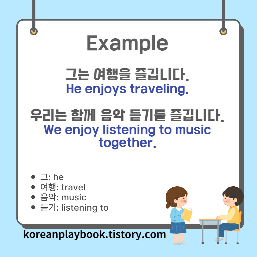 그는 여행을 즐깁니다. (He enjoys traveling.)